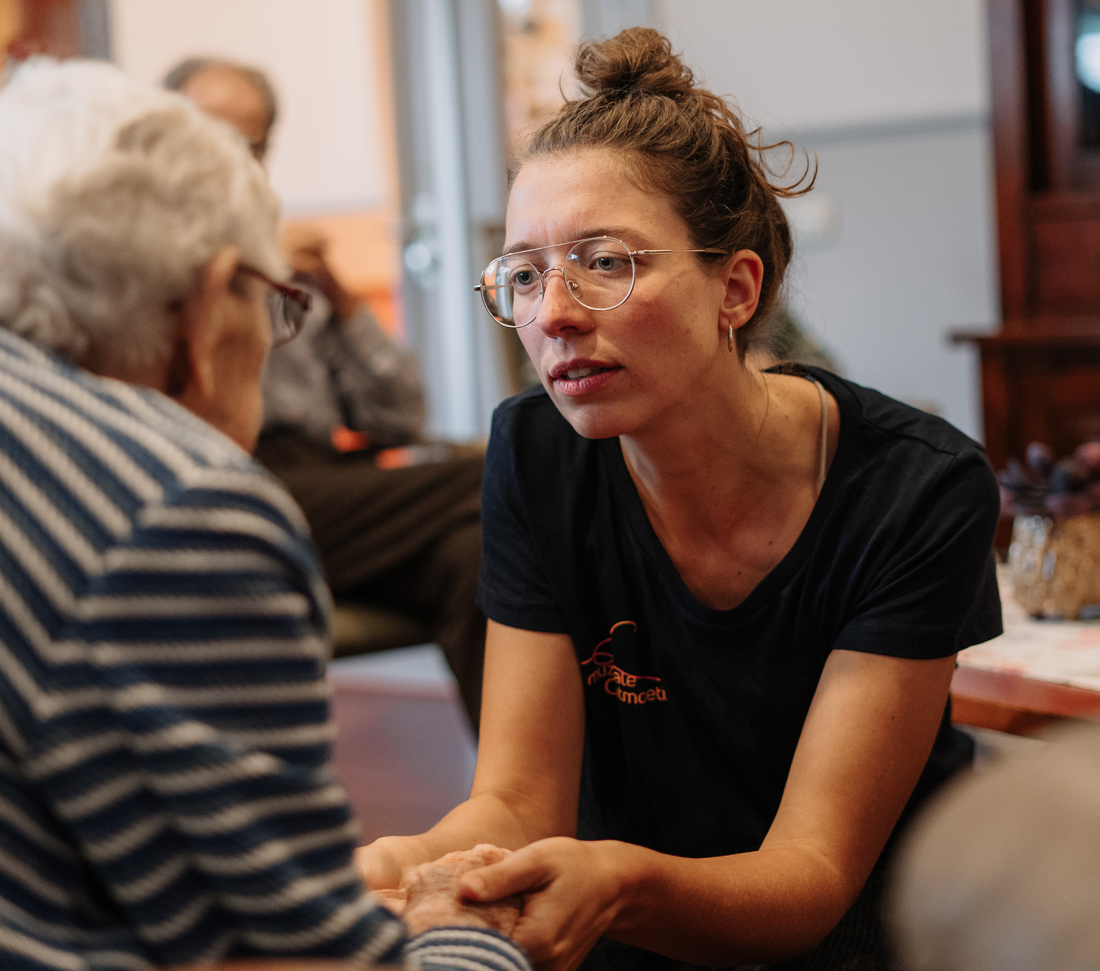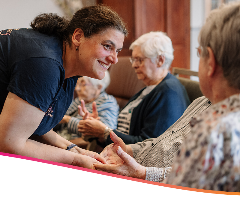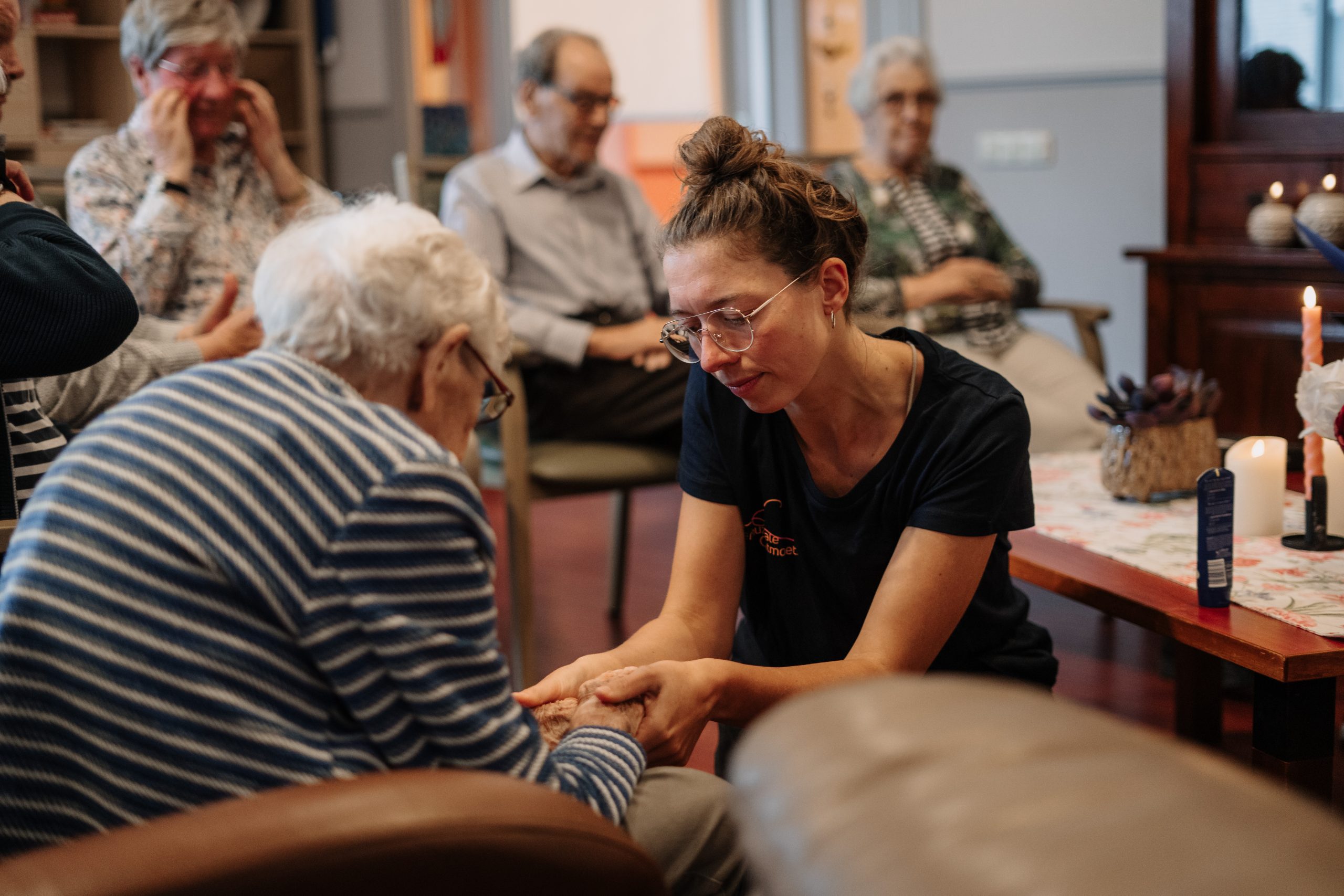 De bewoners zie je ontspannen en zingen wat mee. Sommigen zoeken nabijheid door middel van je hand vast houden.
