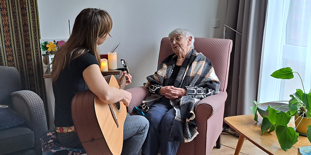 Mensen delen veel gedachten en gevoelens met ons. Herinneringen die dierbaar zijn, de behoefte aan gezelligheid en luchtigheid of juist de behoefte om de angst en verdriet te delen. Muziek kan een uitlaatklep bieden of troost geven. Soms is er vraag naar een eigen lied, passend bij het leven dat iemand geleefd heeft. Wij luisteren en kijken en wanneer mogelijk overleggen we waar iemand behoefte aan heeft.